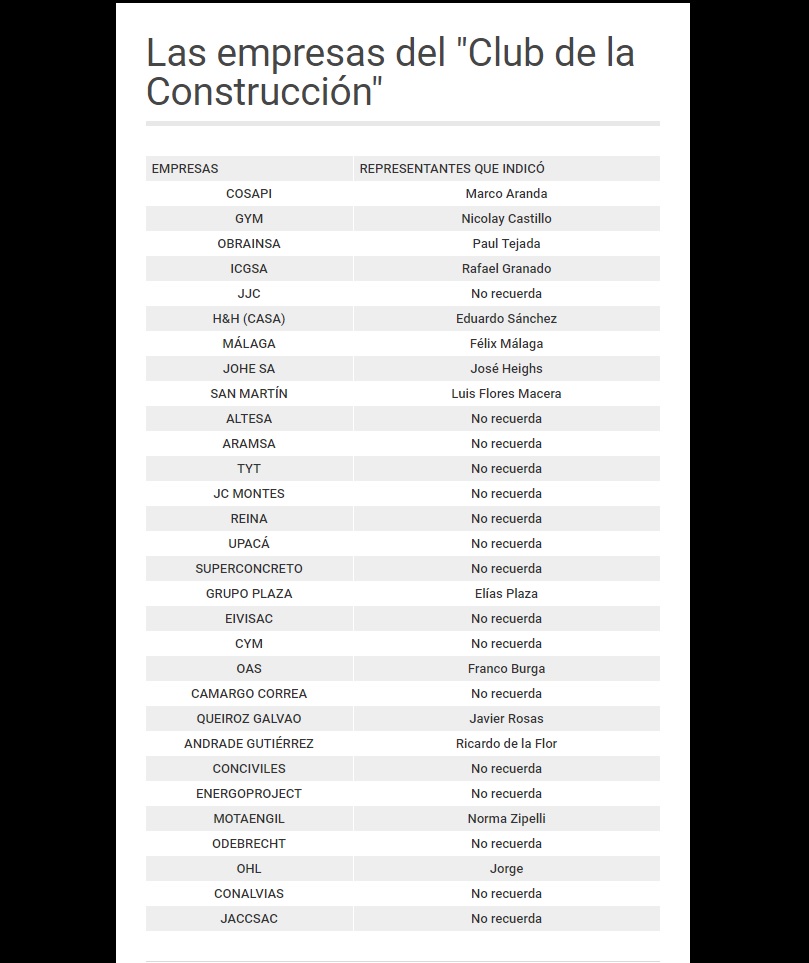 El colaborador eficaz N°6-2017 explicó a las autoridades judiciales cómo es que el grupo se conformaba, donde tenía sus reuniones y cómo operaba. Además, dio una lista de las empresas que lo integraban y sus representantes. Estos son: