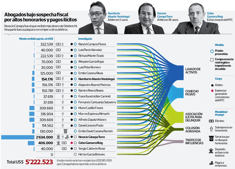 El reciente pedido fiscal de prisión preventiva por 36 meses para 16 investigados en el Caso Arbitrajes de Odebrecht incluye una detallada relación de los presuntos pagos ilícitos y los hechos que se habrían realizado para beneficiar a Odebrecht. La suma de los depósitos bajo sospecha alcanza los US$5’222.523.