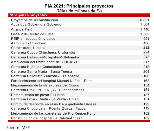 El MEF detalla que este año 2021 se continuará la estrecha coordinación con los tres niveles de gobierno, con el objetivo de lograr el cumplimiento de las metas de ejecución presupuestal de la inversión pública, a fin de que puedan ejecutar el máximo monto presupuestado dado el contexto actual.