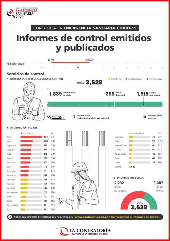 Desde el 24 de febrero la Contraloría General emitió y publicó 3,629 informes como parte de la “Estrategia de Control a la Emergencia Sanitaria COVID-19” en las modalidades de control concurrente, orientación de oficio, visita de control, y otros, para garantizar el buen y correcto uso de los fondos públicos para la atención de la contención de la expansión de COVID-19 en el país.