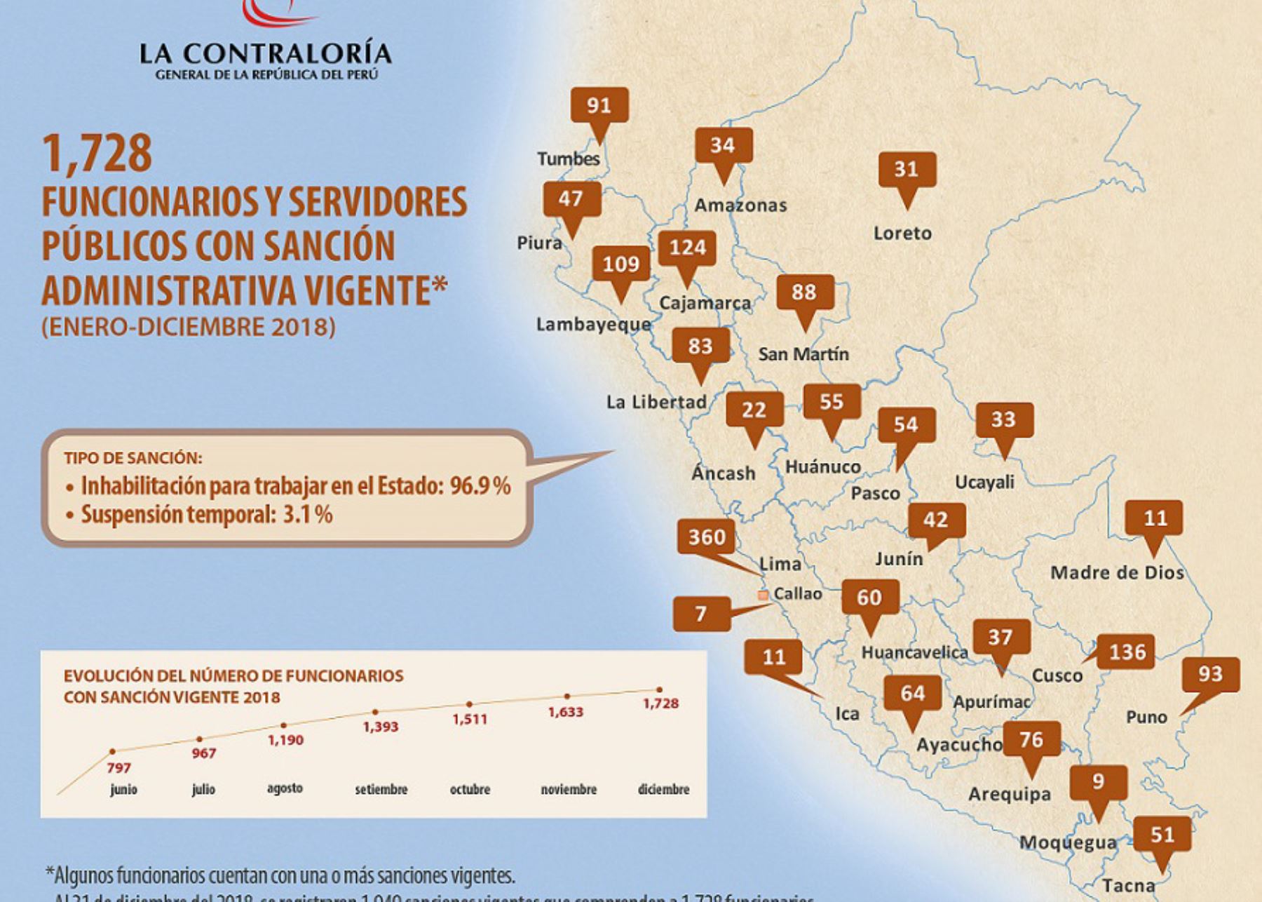 La Contraloría informó que 1,728 funcionarios y servidores públicos fueron suspendidos o inhabilitados temporalmente para trabajar en el Estado, al haber sido sancionados administrativamente por inconducta funcional, al 31 de diciembre de 2018.