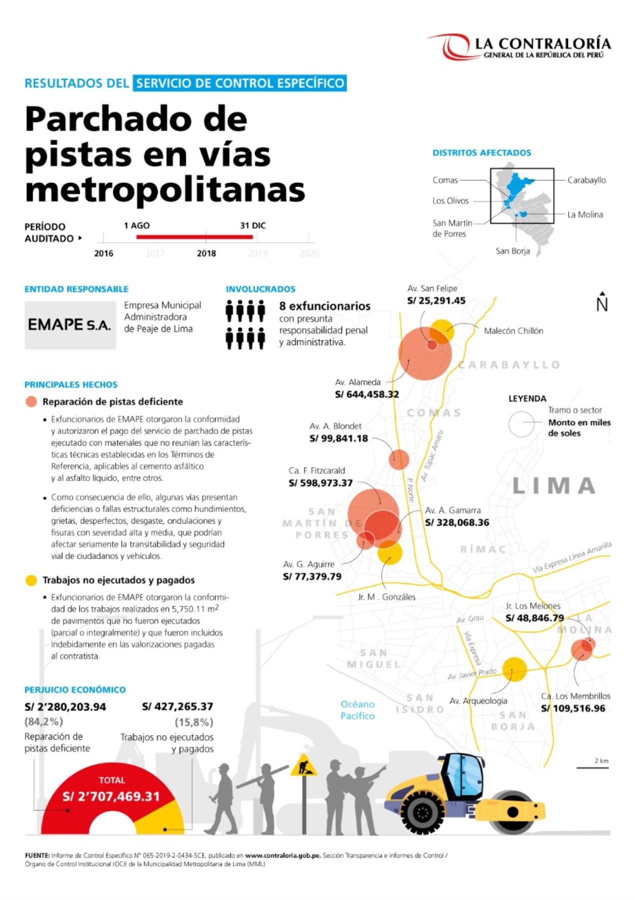 La Contraloría General de la República detectó un perjuicio económico de S/ 2 millones 707 mil 469 en el parchado de pistas de seis distritos limeños cuyo mantenimiento está a cargo de la Empresa Municipal Administradora de Peaje de Lima (Emape S.A.).