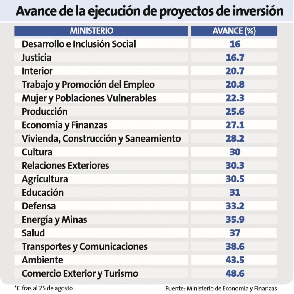 Según el portal del Ministerio de Economía y Finanzas, el avance de ejecución de proyectos de inversión no llega a 50% en ninguna cartera a cuatro meses de que acabe el año.