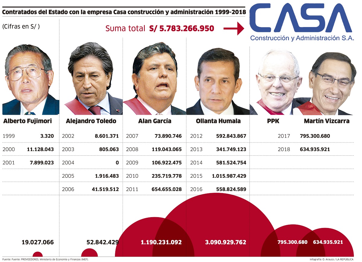 En el mandato de Alan García Pérez, CASA consiguió obras públicas por mil millones 190 mil soles. Pero fue en el periodo de Ollanta Humala que duplicó el monto: 3 mil millones de soles.