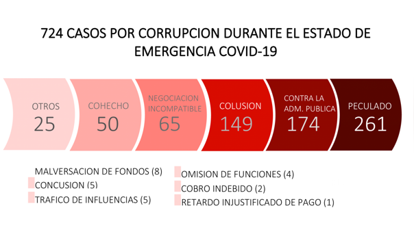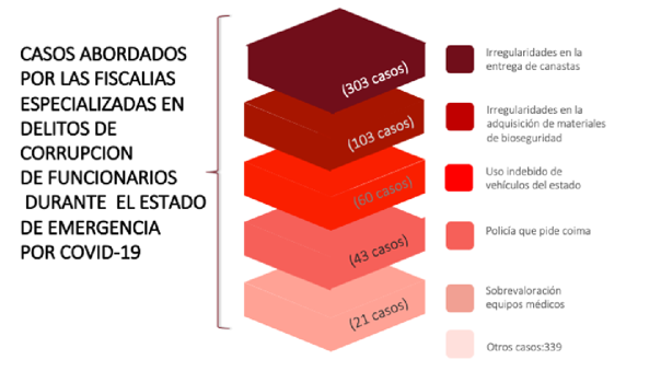 Al cumplirse los primeros 100 días de declarado el Estado de Emergencia en el país debido al nuevo coronavirus, los presuntos casos detectados por las fiscalías anticorrupción aumentaron hasta en 700%. La mayoría de estas investigaciones tienen que ver con delitos por aparentes irregularidades en la adquisición y entrega de canastas de víveres, sobrevaloración de equipos médicos y mascarillas, uso indebido de vehículos del Estado, coimas para favorecer a los intervenidos, beneficio con el bono de S/.380 por parte de funcionarios y sus allegados, o posesión indebida de donaciones por parte de alcaldes. Exactamente fueron reportados 869 casos a nivel nacional.
