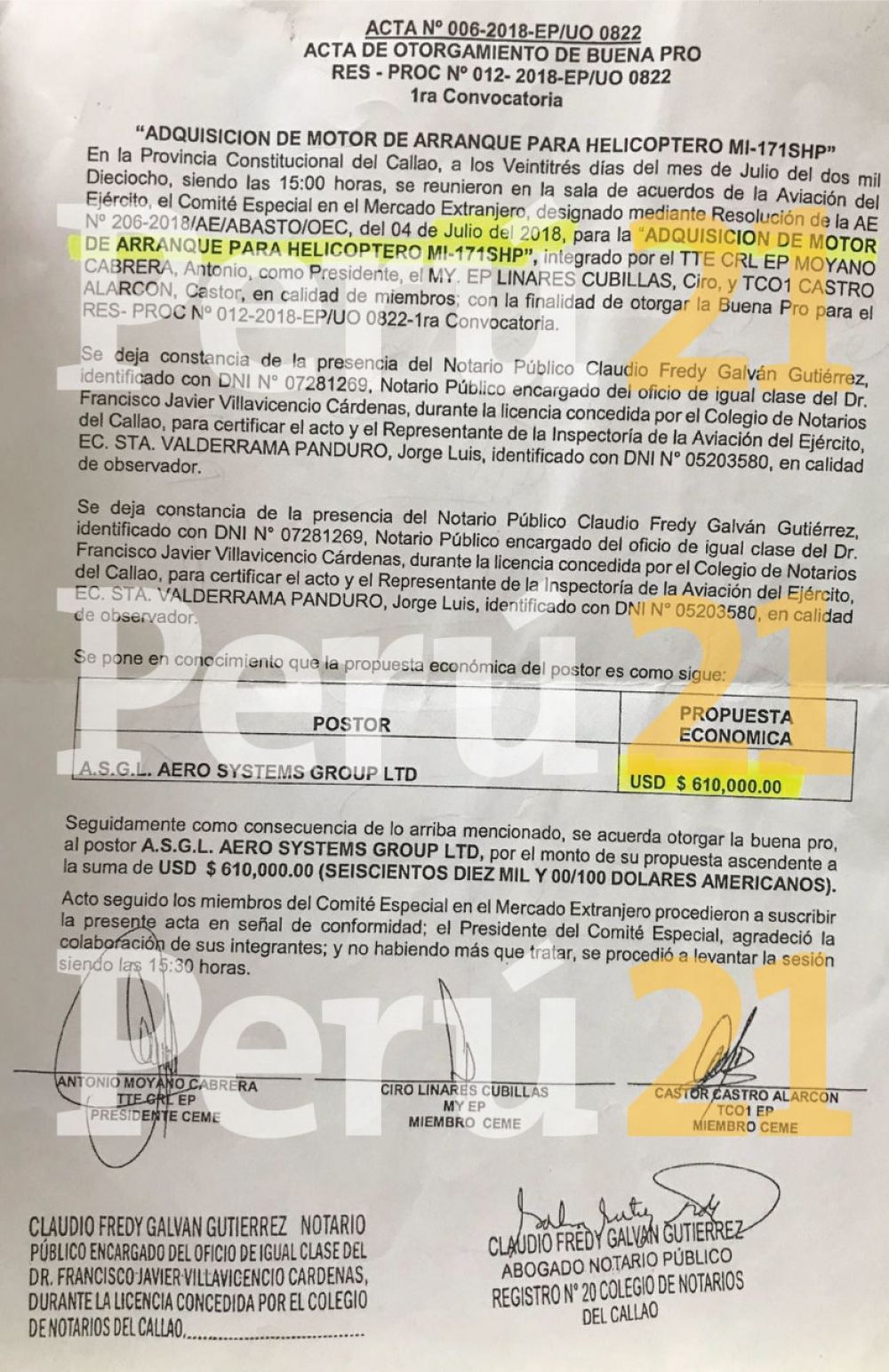 Este diario tuvo acceso a documentos reservados del Ejército que acreditan un proceso de “Adquisición de motor de arranque para helicóptero MI – 17 1SHP”. El 23 de julio de 2018, la Aviación del Ejército otorgó la buena pro a la empresa Aero Systems Group LTD por un monto de 610 mil dólares para que proporcione un motor nuevo para uno de los aparatos rusos.