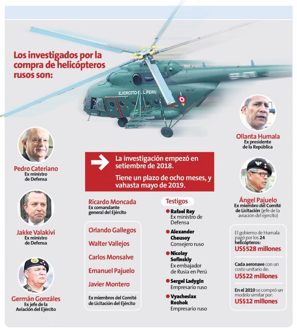 Hoy, el ex ministro de Defensa Pedro Cateriano tiene que desfilar por la Comisión de Defensa del Congreso para responder por la adquisición del satélite francés que se compró durante el quinquenio humalista. Sin embargo, hay otra compra por la que también debe responder en el Ministerio Público: los 24 helicópteros rusos por los que el Perú pagó 528 millones de dólares.