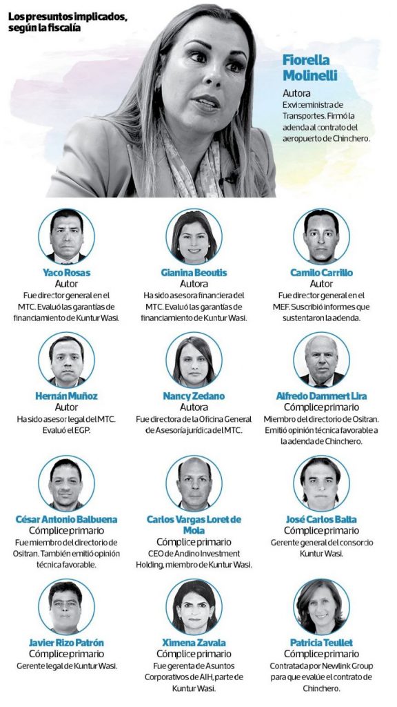El viernes 23, la fiscal Zoila Sueno Chirinos formalizó investigación preparatoria contra ocho ex funcionarios públicos y cinco privados, vinculados a la firma de la adenda del contrato de concesión del aeropuerto de Chinchero, en el 2017.