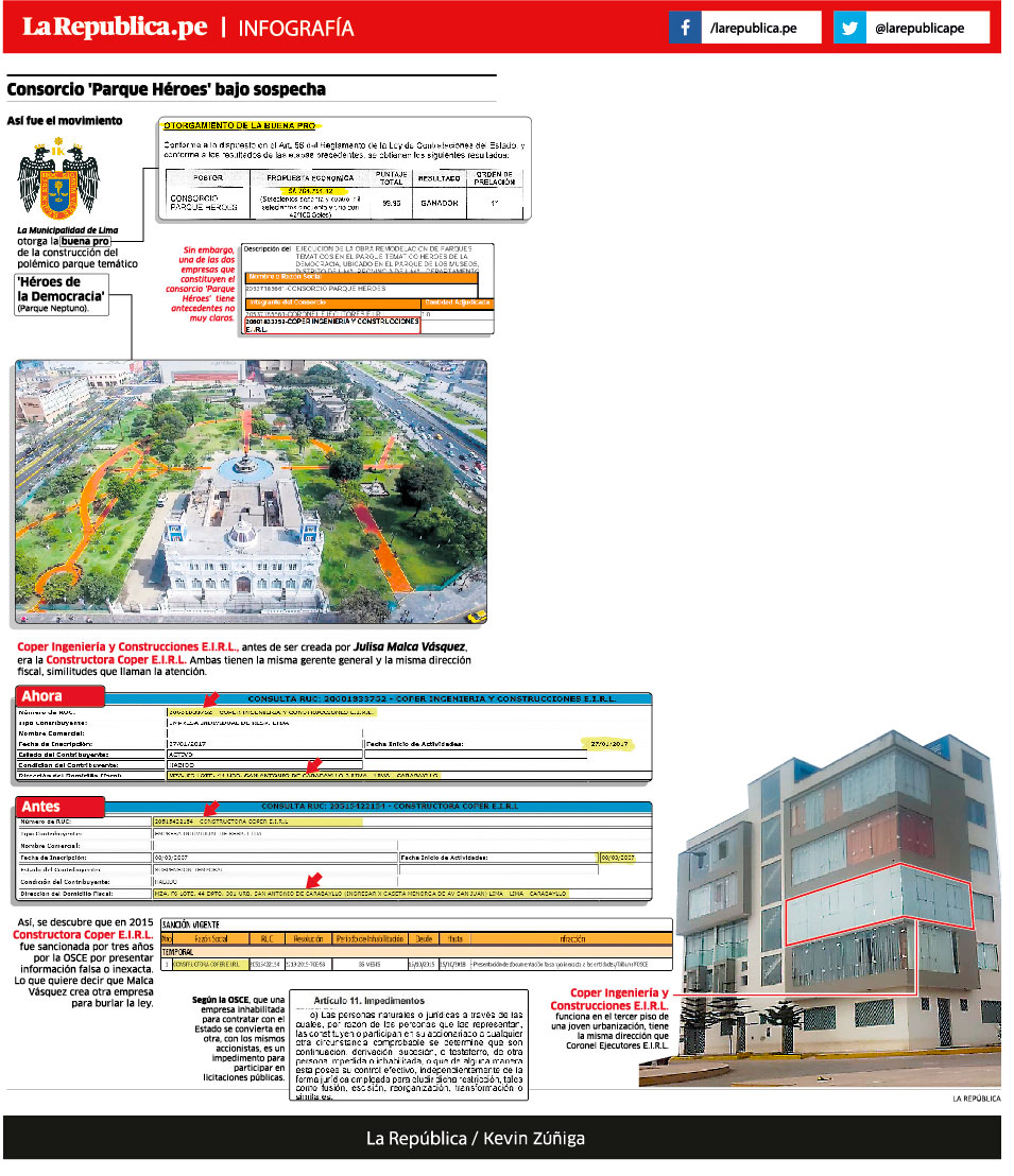 Lo controversial es que ambas empresas –la activa y la inhabilitada– tienen la misma gerente general (Julisa Malca Vásquez) y la misma dirección fiscal (Mz F6, lote 44 en la Urb. San Antonio de Carabayllo). Es más, cuando La República acudió a la dirección, encontró que en el departamento 301 del edificio hallado funciona hoy Coper Ingeniería y Construcciones E.I.R.L., Constructora Coper E.I.R.L. y hasta Coronel Ejecutores E.I.R.L., empresa que integra el consorcio ‘Parque Héroes. “Sí, funcionan acá, pero cada una en sus oficinas”, nos respondieron en la puerta.