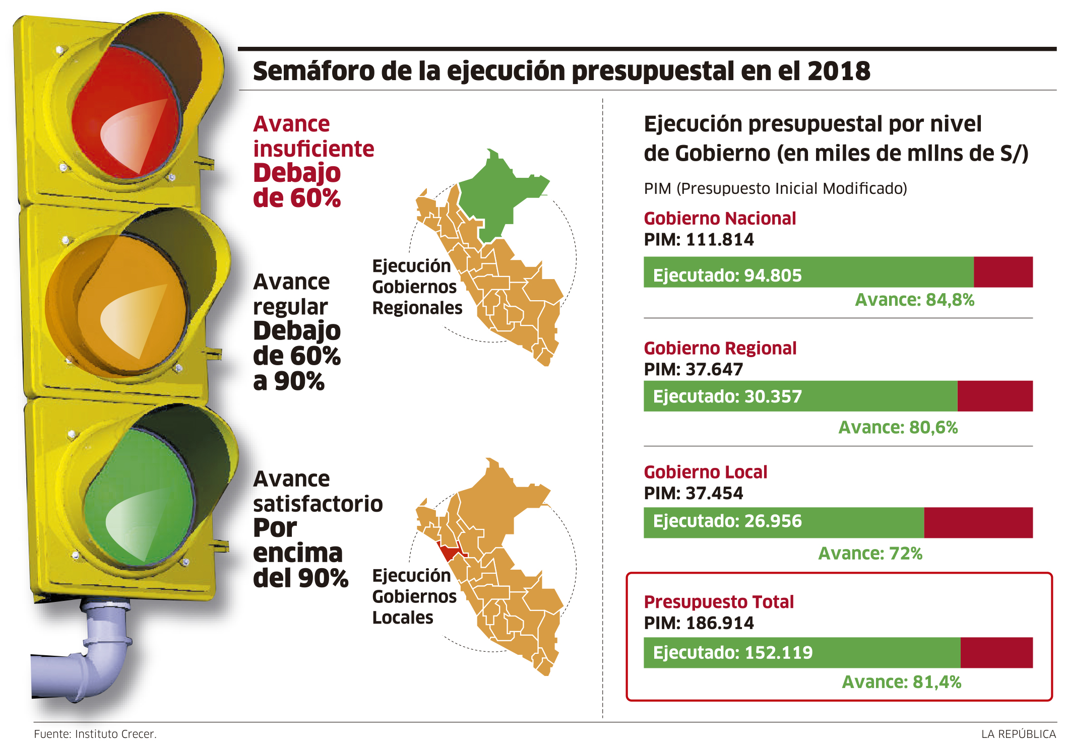 Tal como se muestra en la infografía, durante el 2018 se tuvo un Presupuesto Inicial Modificado (PIM) que supera los S/ 186 mil millones y se ejecutó el 81,4% que es S/ 152 mil millones.