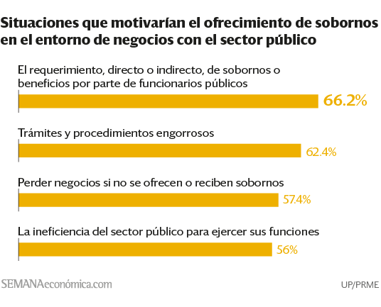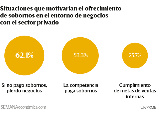 Así, preguntados sobre cuáles serían las situaciones en las que un representante de empresa podría verse motivado a dar o recibir un soborno, el 57.4% indicó que lo haría ante alguna entidad del sector privado, en caso tuviese riesgo de perder un negocios. Sin embargo, no es la razón principal: